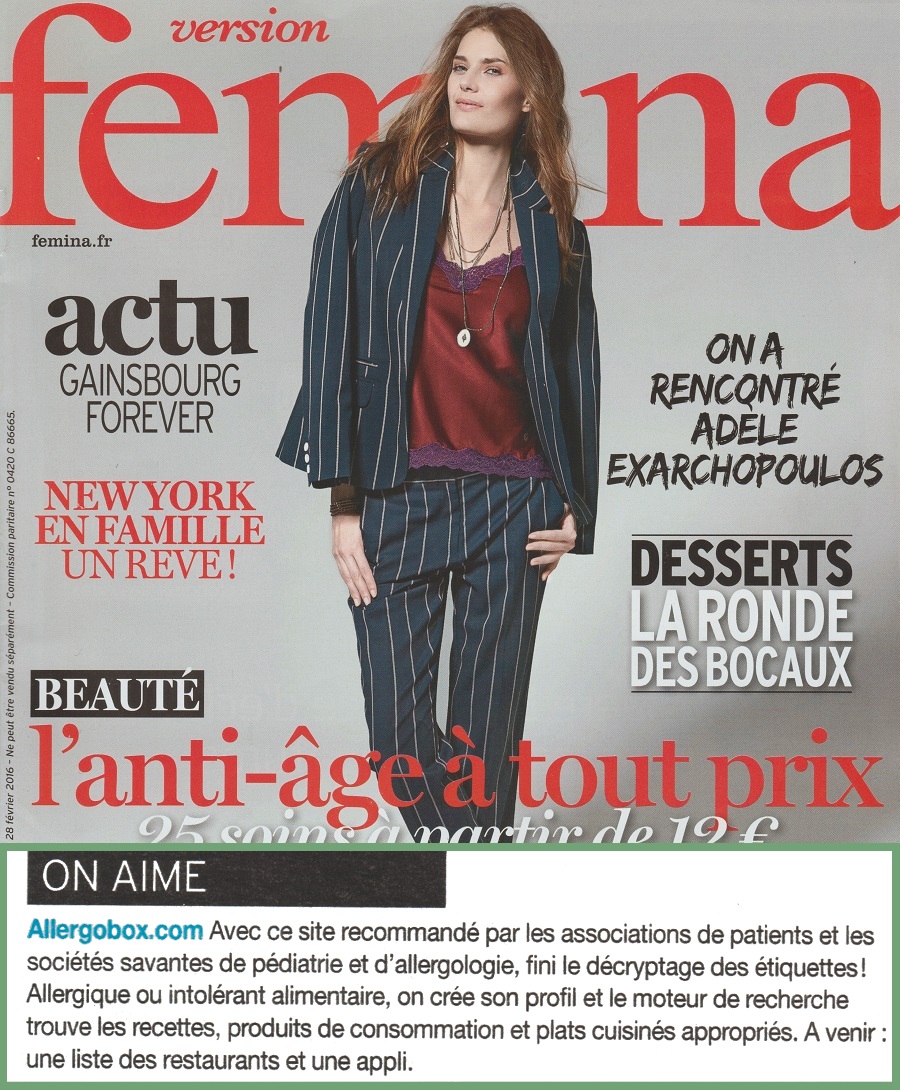 Le magazine Version Femina n°726, supplément présent dans de nombreux quotidiens du dimanche 28 février 2016, présente AllergoBox dans sa rubrique "On aime" des News Santé ! (page 34).