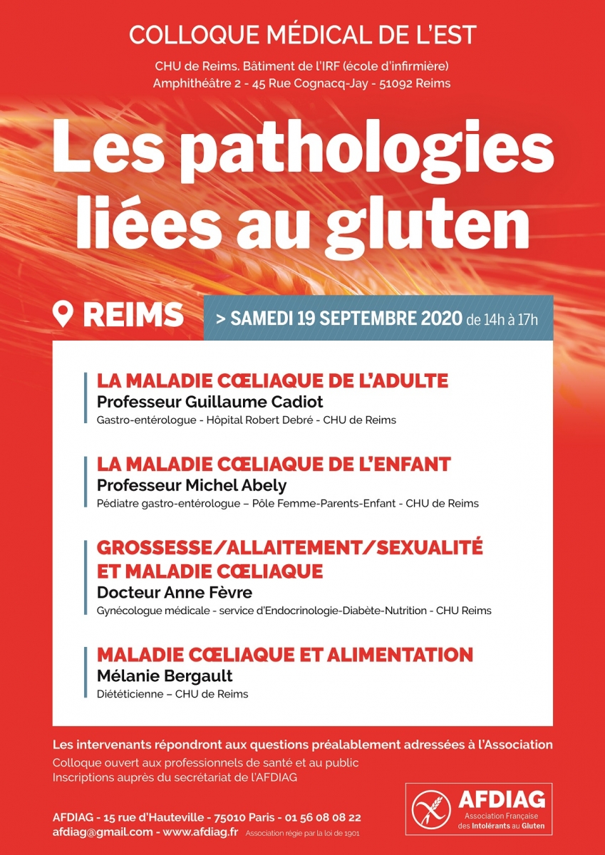 Le prochain colloque médical de l'AFDIAG sur "Les pathologies liées au gluten" aura lieu le samedi 19 septembre à Reims !