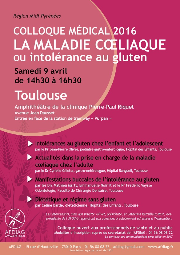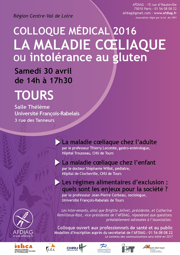 En ce début d'année 2016, l'AFDIAG (Association Française Des Intolérants Au Gluten) organise trois colloques médicaux sur la maladie cœliaque ou intolérance au gluten à Lille, Toulouse et Tours. Ceux-ci sont destinés aux malades mais également aux professionnels de santé. Ils sont gratuits pour les adhérents et les professionnels de santé (médecins, diététiciens, pharmaciens et infirmiers), une participation est demandé pour le public qui désire y participer. L’inscription se fait auprès du secrétariat de l'AFDIAG.