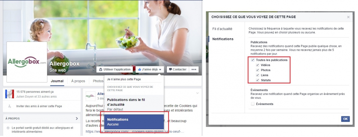 Une fois que vous avez ajouté votre like à la page facebook d’AllergoBox, pour être certain d’être informé de toute l’actualité d’AllergoBox, de nos partenariats, des ajouts de produits, de recettes… il suffit de se rendre dans  « Notifications » du menu « J’aime » de la page, et de sélectionner « Toutes les publications »  comme indiqué en rouge ci-dessous.