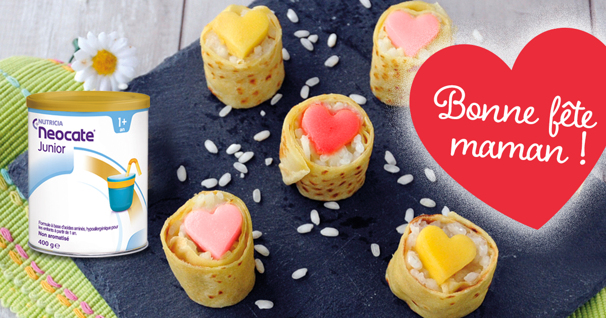 Votre médecin a prescrit Neocate® Junior à votre enfant ? Pour partager un bon repas en famille pour la fête des mamans, notre partenaire NUTRICIA vous a élaboré une recette spéciale pour votre bébé allergique aux protéines de lait de vache : des makiris garnis aux fruits de saison. Cette recette éveillera les papilles de votre bébé à coup sûr !
