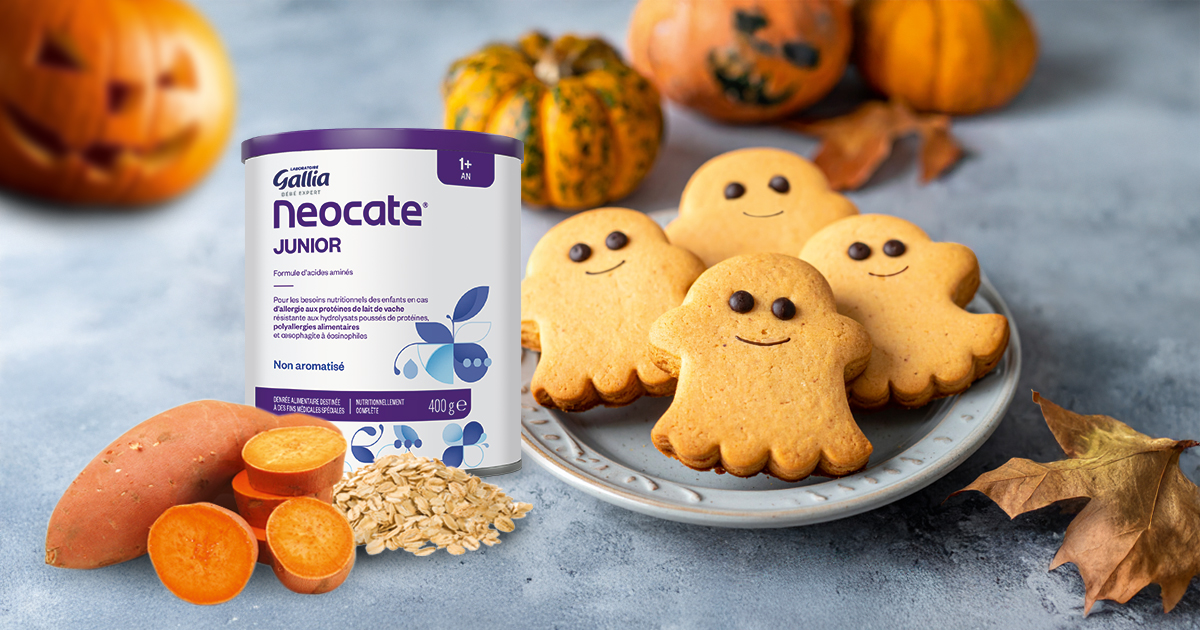 Votre médecin a prescrit Neocate® Junior à votre enfant ? Nutricia vous propose des fantômes croquants à la patate douce pour célébrer Halloween ! De délicieux biscuits réalisés avec des flocons d’avoine et de la patate douce, façonnés en adorables petits fantômes. Une recette ludique et gourmande qui fera frissonner de plaisir votre petit bout.