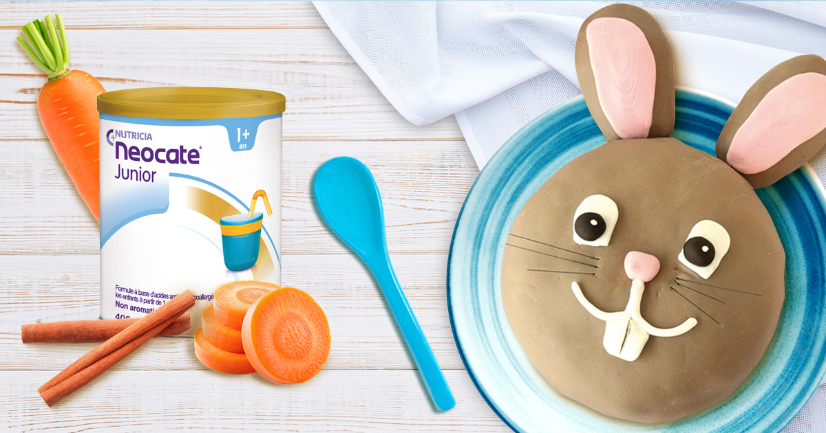Votre médecin a prescrit Neocate® Junior à votre enfant ?  Comment célébrer Pâques dignement avec votre bébé ? Avec sa formule d’acides aminés, notre partenaire NUTRICIA vous propose une toute nouvelle recette spéciale lapin de Pâques ! Concoctez-lui ce PETIT LAPIN FACON CARROTCAKE sans protéines de lait de vache !