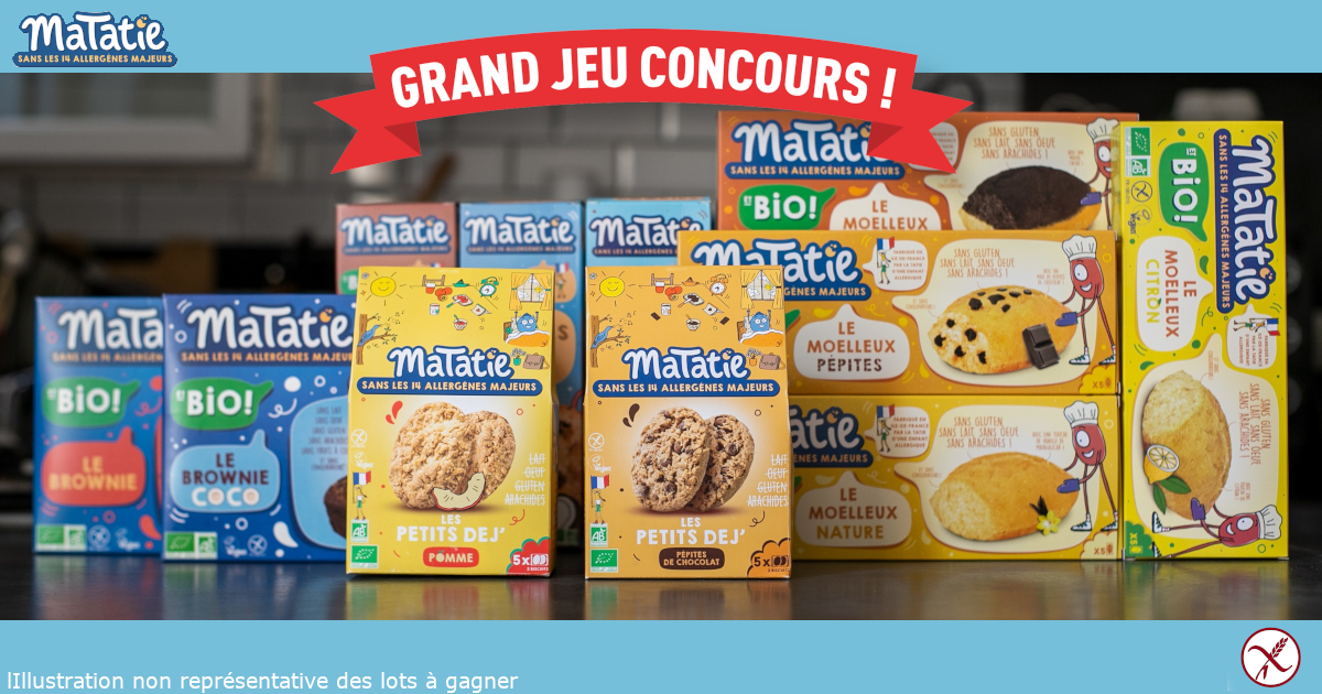 Et pour en profiter tout en variant les plaisirs, L’AFDIAG vous propose de gagner 5 paniers garnis de 7 produits Matatie en participant à ce concours via AllergoBox ! Chaque panier contiendra ainsi :