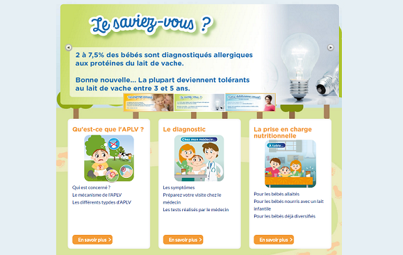 Rendez-vous sur www.allergieaulaitdevache.fr pour découvrir le tout nouveau site, repensé pour vous proposer des informations plus claires et mieux hiérarchisées, dans un univers enfantin, pour vos ptits bouts APLV.