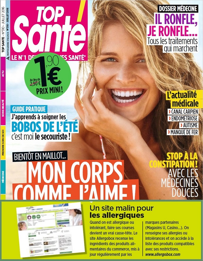 Le magazine Top Santé n°310 de juillet 2016 présente AllergoBox dans son dossier Nutrition comme le "site malin pour les allergiques" ! (page 127)