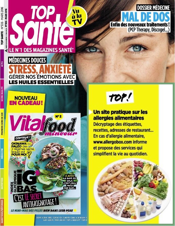 Le magazine Top Santé n°306 du 02 février 2016 présente AllergoBox dans la rubrique "Actu... à suivre" rédigée par le Dr Pierrat (Page n°14).