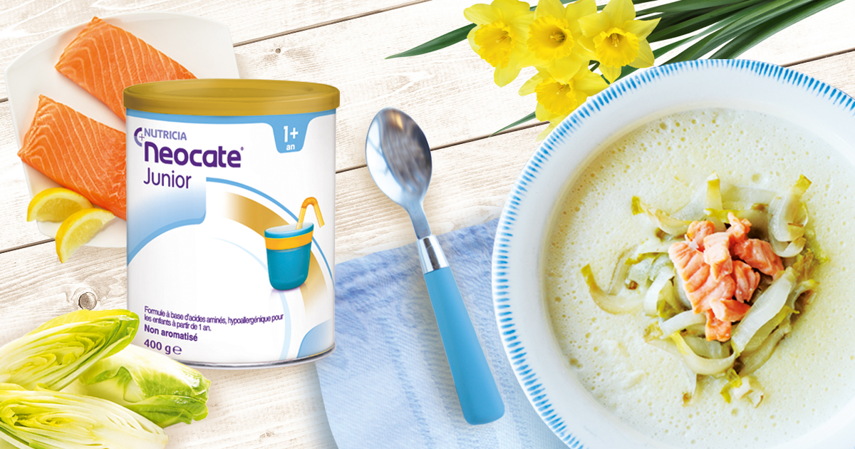 Votre médecin a prescrit Neocate® Junior à votre enfant ? Pour l’arrivée du printemps, venez découvrir l’association d’un légume de saison au Neocate Junior, proposé par notre partenaire NUTRICIA: une recette simple et originale qui mettra à l’honneur les endives et le saumonune très belle occasion de diversifier l’assiette de bébé ! C'est en lui faisant découvrir très tôt la vaste palette de saveurs, qu'il acceptera plus tard de "manger de tout"; n'hésitez donc pas à lui proposer dès maintenant les légumes comme les endives ou les choux!