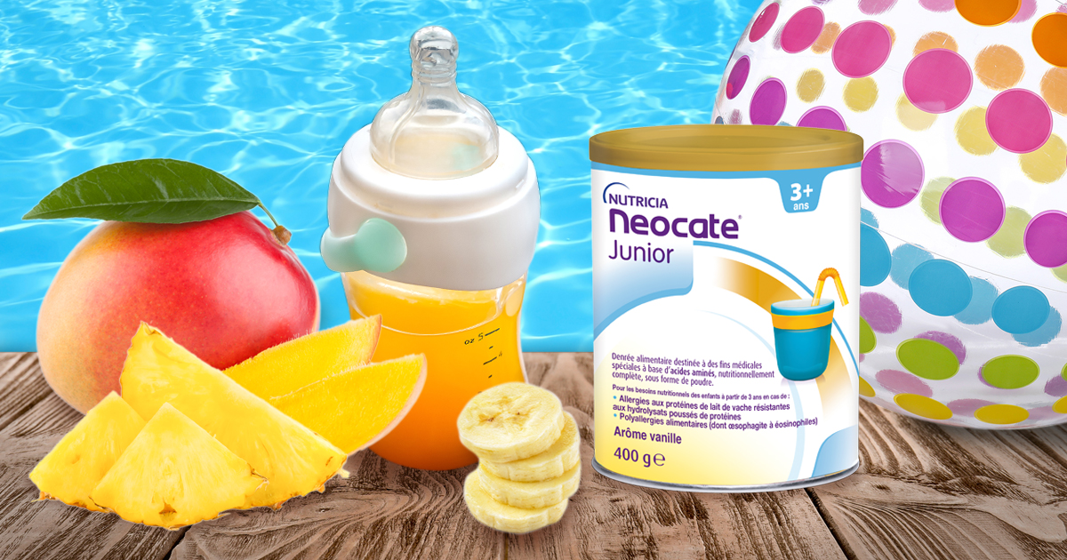 Votre médecin a prescrit Neocate® Junior Vanille à votre enfant ? Pour profiter de la chaleur estivale, notre partenaire NUTRICIA vous a élaboré une recette adaptée à votre bébé allergique aux protéines de lait de vache : un smoothie exotique à l’ananas, mangue et banane. De quoi bien se rafraîchir en été !
