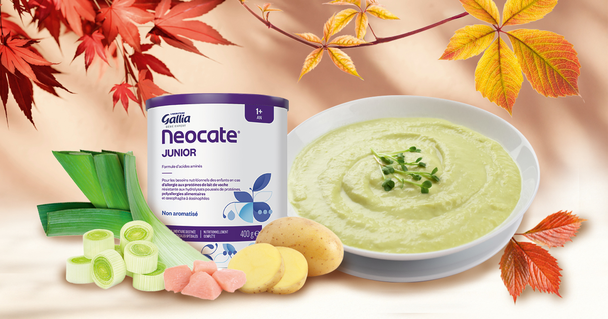 Votre médecin a prescrit Neocate® Junior à votre enfant ? Avec les températures qui baissent, Nutricia vous propose une compotée savoureuse de poireau, pomme de terre et dés de poulet pour régaler votre petit bout ! Une alliance de textures et de saveurs qui associe la douceur des légumes à la tendresse du poulet. Une recette gourmande et réconfortante qui éveillera les papilles de votre enfant.