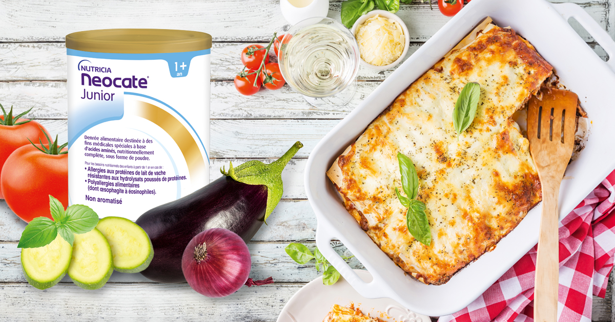 Votre médecin a prescrit Neocate® Junior à votre enfant ? En cette saison grisonnante, notre partenaire NUTRICIA vous propose de réchauffer l’ambiance avec ces lasagnes à la ratatouille. Une recette d’inspiration italienne et sans protéines de lait de vache, parfaite pour initier bébé aux nouvelles textures. En utilisant des petits plats individuels colorés pour les différencier, vous pouvez adapter cette recette (une version avec et une version sans Neocate® Junior) pour que toute la famille ait plaisir à partager ce repas convivial.