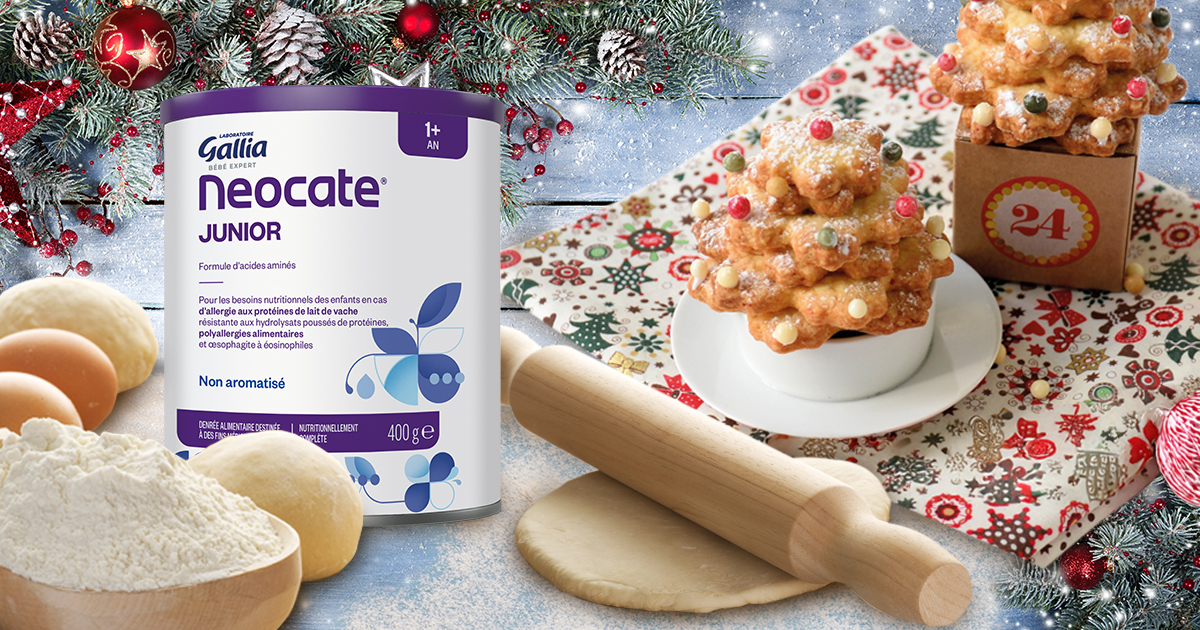 Votre médecin a prescrit Neocate® Junior à votre enfant ? Pour célébrer les fêtes de fin d’année de manière conviviale avec votre bébé, NUTRICIA vous propose une délicieuse recette sans protéines de lait de vache à adapter selon les goûts de bébé. Une pâte sablée, afin de réaliser et décorer les plus beaux sablés de Noël !