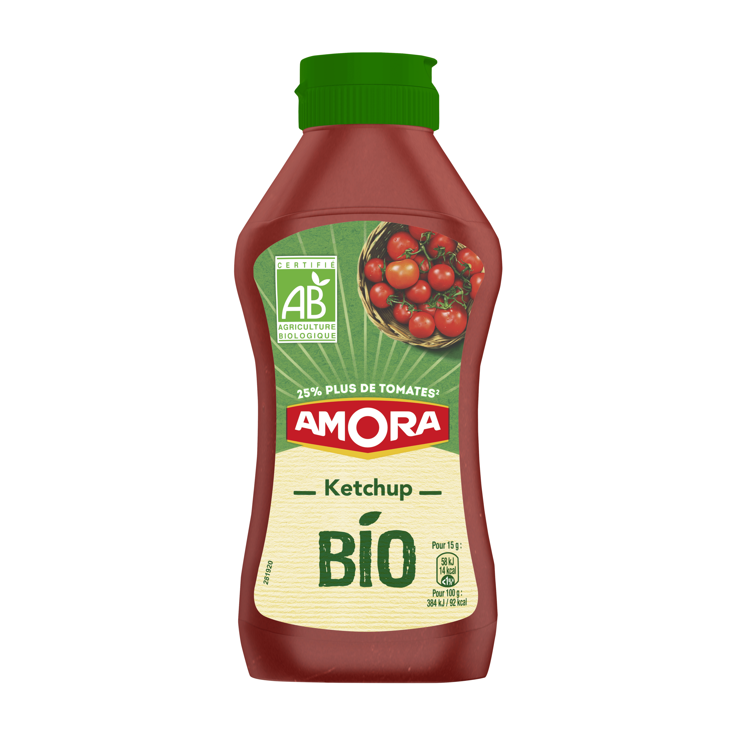 Ingrédients : tomate¹ (190 g de tomates pour 100 g de ketchup), sucre¹, vinaigre d'alcool¹, eau, sel, épices¹. ¹Ingrédients issus de l'agriculture biologique.