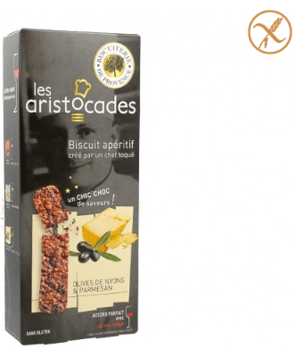 AMANDES 37%, OEUFS, olives de nyons AOP 13%, olives noires du bassin mediterranéen, sucre, PARMESAN AOP 2%, thym, poivre. sans gluten
