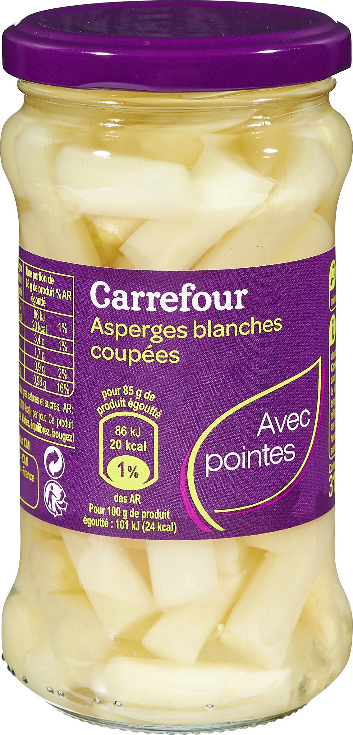Asperges blanches coupées (dont pointes 15% minimum), eau, sel, acidifiant: acide citrique