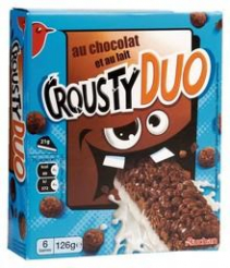 Céréales croustillantes cacaotées 41% (farine de blé 24,5%, sucre, farine d'avoine, cacao maigre 3,4%, farine de malt d'orge, lait écrémé en poudre 1%, malt de blé, sel, arôme naturel), sirop de glucose, chocolat blanc 16% (sucre, beurre de cacao, lait entier en poudre 3,5%, émulsifiant: lécithines de soja et tournesol, extrait de vanille), huile de tournesol, crème en poudre 3,4%, stabilisant: sorbitols, chocolat en poudre 1,2% (pâte de cacao, sucre, cacao maigre), émulsifiant: lécithines de soja, arôme, antioxydant: extrait riche en tocophérols.