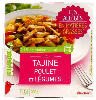 Légumes en proportions variables 33,5% (carottes, courgettes, navets, pois chiches, oignons, poivrons, céleri ), poulet rôti traité en salaison 20% (filet de poulet 19,4%, sel, amidon, dextrose), pomme de terre préfrite 20% (pomme de terre, huile de tournesol), eau, oignons préfrits (oignons, huile de tournesol), miel, raisins secs 1% (raisins secs, huile de tournesol, conservateur : anhydride sulfureux (contient sulfites )), double concentré de tomates, huile d'olive, jus de citron concentré 0,5%, sel, sucre, cumin 0,1%, curcuma 0,1%, coriandre 0,1%, épices (cannelle, gingembre, girofle, muscade), épaississant : gomme xanthane - gingembre 0,04%, extrait de piment 0,01%.  elaboré à partir de poulet origine ue ou hors ue. pourcentages exprimés sur le total de la recette.