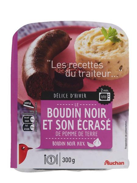 Boudin noir aux oignons 39.3% (sang de porc, oignons 13,3%, gras de porc, couenne, sel, sucre, épices, enveloppe : boyau naturel de porc), pomme de terre 25,2%, eau, crème fraîche 12% (contient lait ), flocons de pomme de terre 2,7% (flocons de pomme de terre, émulsifiant : mono- et diglycérides d'acides gras),  lait écrémé en poudre, beurre (contient lait ), ciboulette 0,6%, sel, poivre. pourcentages exprimés sur le total de la recette.