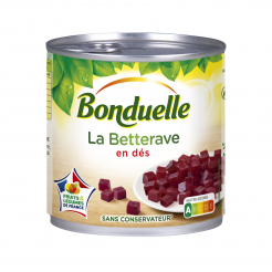 Betteraves en dés, eau, sucre, jus de citron concentré, sel, vinaigre d'alcool.