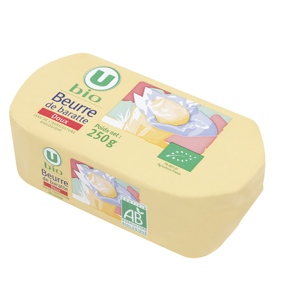 Beurre de baratte pasteurisé doux issu de l'agriculture biologiqueBeurre de baratte pasteurisé doux issu de l'agriculture biologique