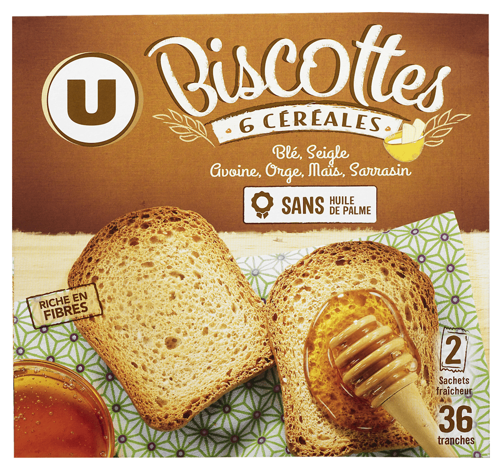 Biscottes aux 6 céréales U boîte 36 tranches 300gBiscottes aux 6 céréales U boîte 36 tranches 300g