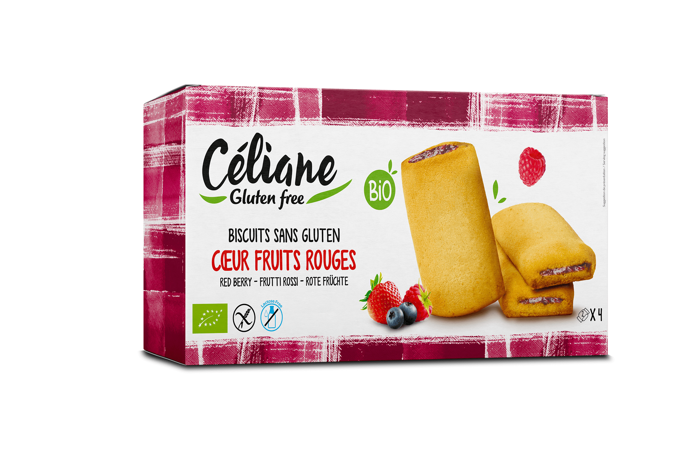 Fourrage aux fruits rouges* 25 % (eau, sirop de glucose-fructose* (maïs), sucre de canne*,purée de framboise* 10 %, purée de fraise* 10 %, purée de myrtille* 10 %, jus concentré de citron*, gélifiant : pectines, correcteur d’acidité : carbonates de potassium, arôme naturel*), farine de riz semi-complète*, oeufs*, sucre de canne*, huile de palme*, fécule de pomme de terre*, sirop de riz*, épaississant : gomme guar*, poudre à lever : carbonates de sodium, sel marin. *Ingrédients issus de l’agriculture biologique