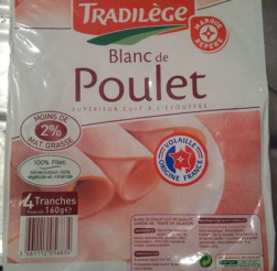 Blanc de poulet cuit de qualite superieure traite en salaison filet et filet interne de poulet 88% (origine France), eau, sel, dextrose, gelifiant : E407a, aromes, antioxydant : E316, conservateur : E250, colorant : caramel ordinaire.