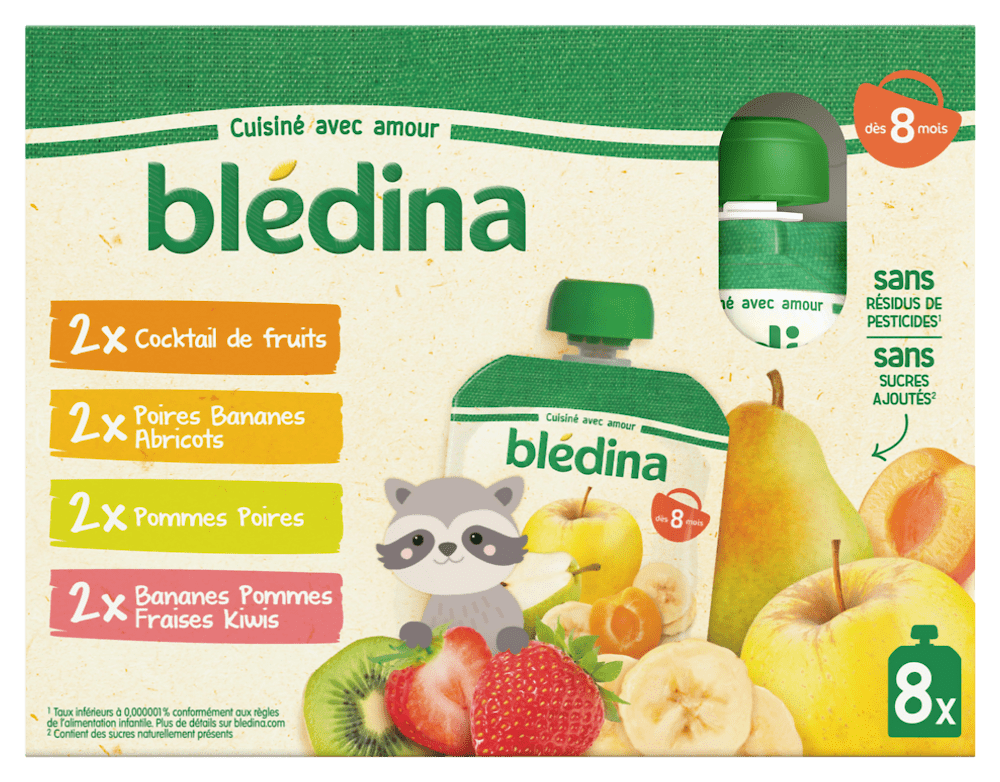 BLEDina gourdes fruits cocktail de fruits : purée de pommes 57,4 % - purée de poires 17,5 % - purée de bananes 13,0 % - purée d'abricots 12,0 % - vitamine c - jus de citron concentré*. * présence en fonction de l'acidité des fruits. BLEDina gourdes fruits poires bananes abricots : purée de poires 42,4 % - purée de bananes 40,0 % - purée d'abricots 17,5 % - vitamine c - jus de citron concentré*. * présence en fonction de l'acidité des fruits. BLEDina gourdes fruits pommes poires : purée de pommes 64,9 % - purée de poires* 35,0 % - vitamine c - jus de citron concentré. BLEDina gourdes fruits bananes pommes fraises kiwis : purée de bananes 33,0 % - purée de pommes 28,4 % - purée de fraises 20,0 % - purée de kiwis 17,0 % - purée de carottes pourpres - vitamine c - jus de citron concentré.