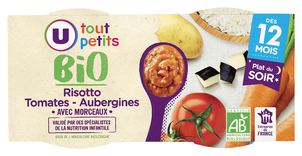 Bols risotto/tomate/aubergine 12mois U.T.PETITS BIO 2x200gBols risotto/tomate/aubergine 12mois U.T.PETITS BIO 2x200g