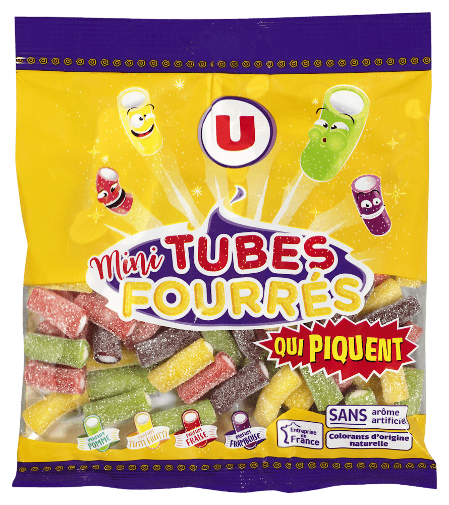 Bonbons mini tubes fourrés qui piquent U sachet 200gBonbons mini tubes fourrés qui piquent U sachet 200g