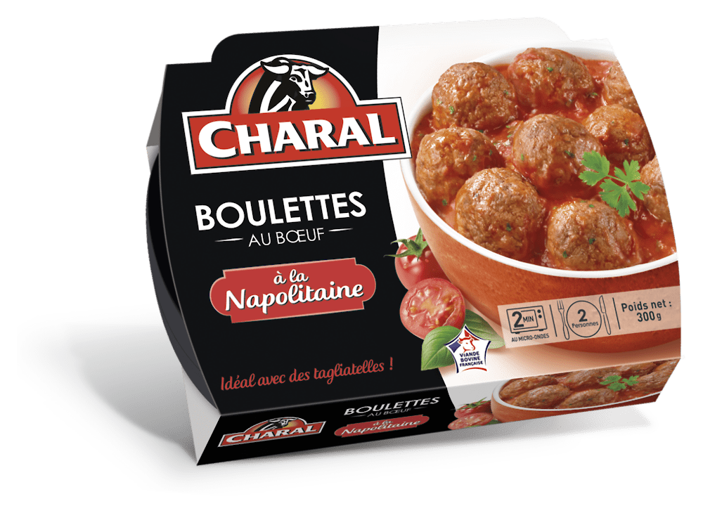 Boulettes au boeuf 50% : viande bovine hachée 51% (soit 25% du produit fini total), protéines végétales de SOJA réhydratées 25% (soit 12.5% du produit fini total), eau, chapelure (farine de BLÉ, sel), sel, oignons frits à l'huile de tournesol, sucre caramélisé, arômes, sauce à la napolitaine 50% : eau, concentré de tomates 23% (soit 11.5% du produit fini total), sucre, persil, amidon transformé de maïs, sel, oignon et ail déshydratés, arômes, basilic