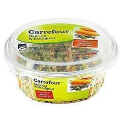 INGREDIENTS : Boulgour cuit 29.5% (eau, blé dur précuit concassé), quinoa cuit 29.5% (eau, quinoa blanc et rouge), carotte jaune 12%, carotte 8%, graines de courge 6%, marinade (basilic, eau, huile de colza, huile d'olive, jus de citron jaune, ail, sel, poivre noir, stabilisant : gomme xanthane, curcuma),  huile de colza, jus de citron à base de concentré, vinaigre d'alcool, moutarde (eau, graines de moutarde, vinaigre d’alcool, sel), ciboulette, sel, coriandre, poivre, épaississants : gomme guar et gomme xanthane.