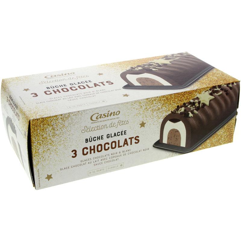 Bûche glacée 3 chocolats (glaces chocolats noir & blanc, glace chocolat au lait avec copeaux de chocolat noir, sauce chocolat)Bûche glacée 3 chocolats (glaces chocolats noir & blanc, glace chocolat au lait avec copeaux de chocolat noir, sauce chocolat)