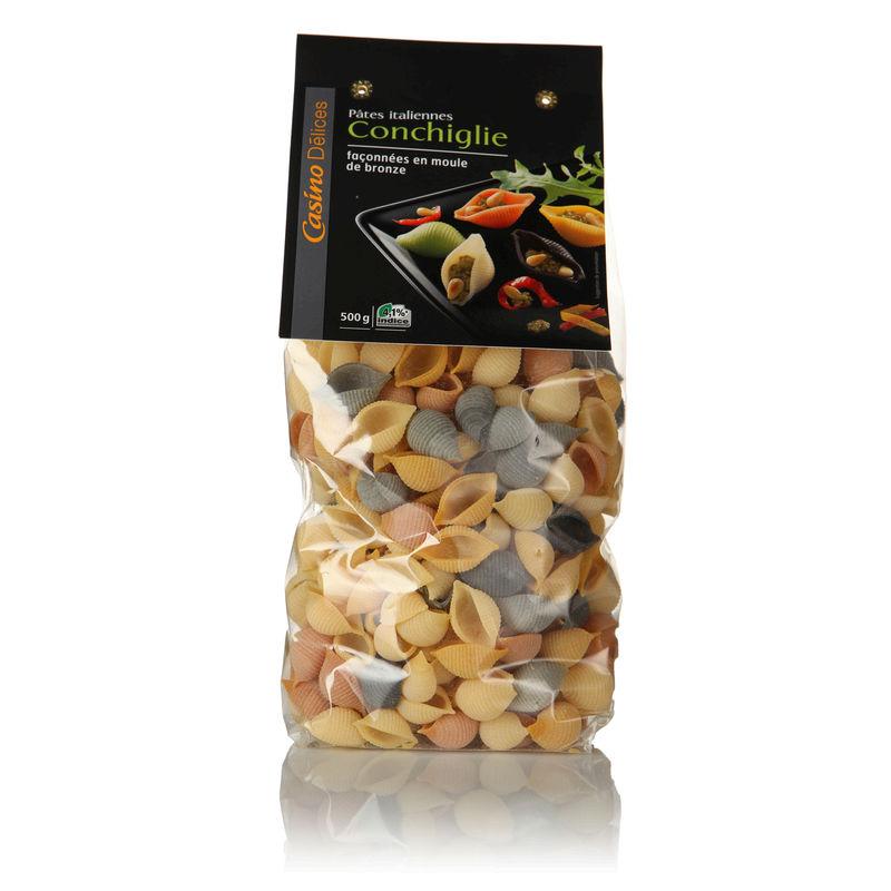 Casino Délices Conchiglie 5 couleurs pâtes italiennes façonnées en moule de bronze - 500gCasino Délices Conchiglie 5 couleurs pâtes italiennes façonnées en moule de bronze - 500g