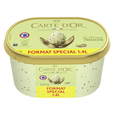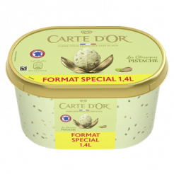 Ingrédients : LAIT ÉCRÉMÉ réhydraté, CRÈME fraîche¹ (12%), sucre, sirop de glucose, sirop de glucose-fructose, LAIT concentré écrémé, morceaux de PISTACHE (3%), BEURRE concentré, pâte de PISTACHE (1,5%), LACTOSE et PROTÉINES DE LAIT, stabilisants (farine de graines de caroube, gomme guar, carraghénanes), émulsifiant (mono- et diglycérides d'acides gras), épinard en poudre, arôme naturel, colorant (curcumine).