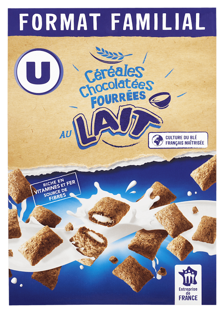 Céréales chocolatées fourrées au lait U paquet 600gCéréales chocolatées fourrées au lait U paquet 600g