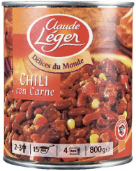 Haricots rouges précuits 35%, eau, viande de boeuf (origine : France) 15%, carotte, concentré de tomate, maïs 3%, poivron rouge, poivron vert, amidon transformé de maïs, farine de BLÉ, sel, cumin, ail, sucre, piment, colorant : extrait de paprika.
