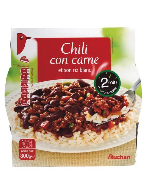 Riz blanc précuit 33% (riz blanc, eau, sel, huile de colza), eau, viande bovine cuite 14% (viande bovine (origine France), sel), haricots rouges réhydratés 14% (haricots rouges, eau), concentré de tomates, poivrons rouges, poivrons verts, oignons, sel, sucre, amidon de manioc, MOUTARDE forte de dijon (eau, graines de MOUTARDE, vinaigre d'alcool, sel, acidifiant : acide citrique, conservateur : MÉTABISULFITE de potassium) ; épaississants : gomme xanthane, gomme guar ; Cumin, arôme, piment, paprika.