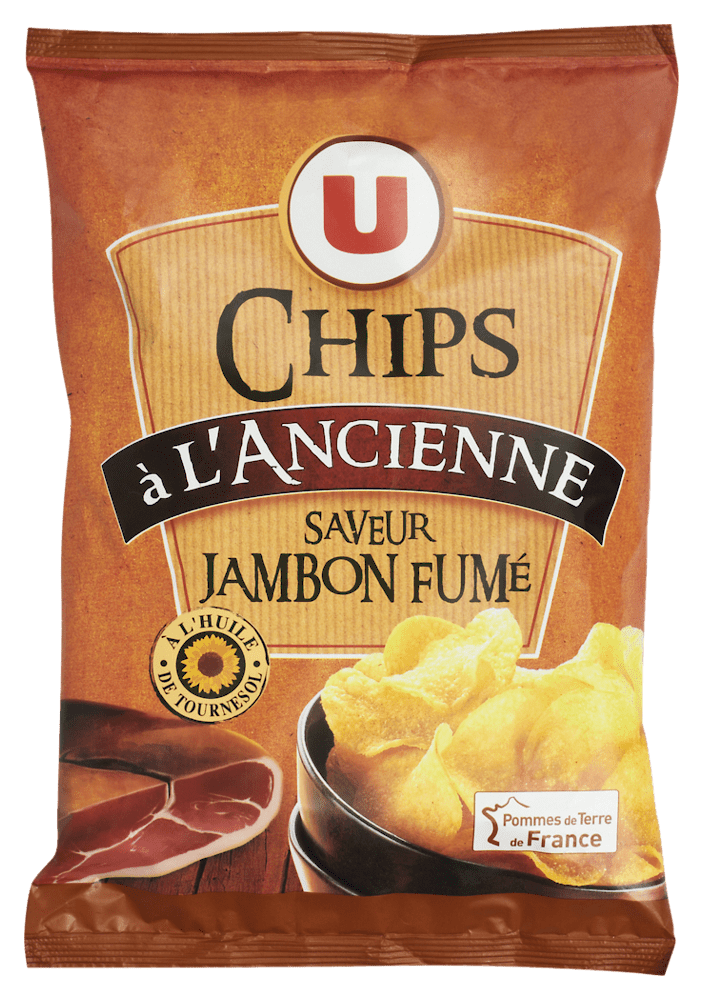 Chips à l'ancienne saveur jambon fumé U sachet 135gChips à l'ancienne saveur jambon fumé U sachet 135g