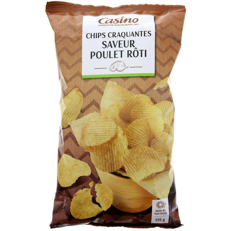 Pommes de terre - huile de tournesol 35% - assaisonnement saveur poulet braisé (maltodextrine - farine de BLÉ - dextrose - extraits de levure - arôme - sel - oignon déshydraté - viande et graisse de poulet en poudre - ail déshydraté - colorant: extrait de paprika - antioxydant : extrait de romarin), sel. Les informations en majuscules sont destinées aux personnes intolérantes ou allergiques.