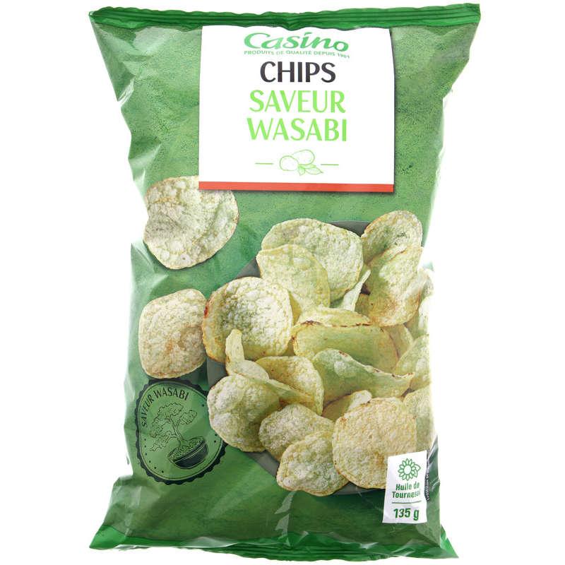 Pommes de terre - huile de tournesol 34% - assaisonnement saveur wasabi [farine de BLÉ - dextrose - chapelure (farine de BLÉ - sel - poudre à lever : carbonates d’ammonium) - arômes - extrait de levure - sel - acidifiants : acétate de sodium, acide citrique - poudre d’oignon - colorant : complexes cuivriques des chlorophylles - huile de tournesol] - sel. Les informations en gras sont destinées aux personnes intolérantes ou allergiques.