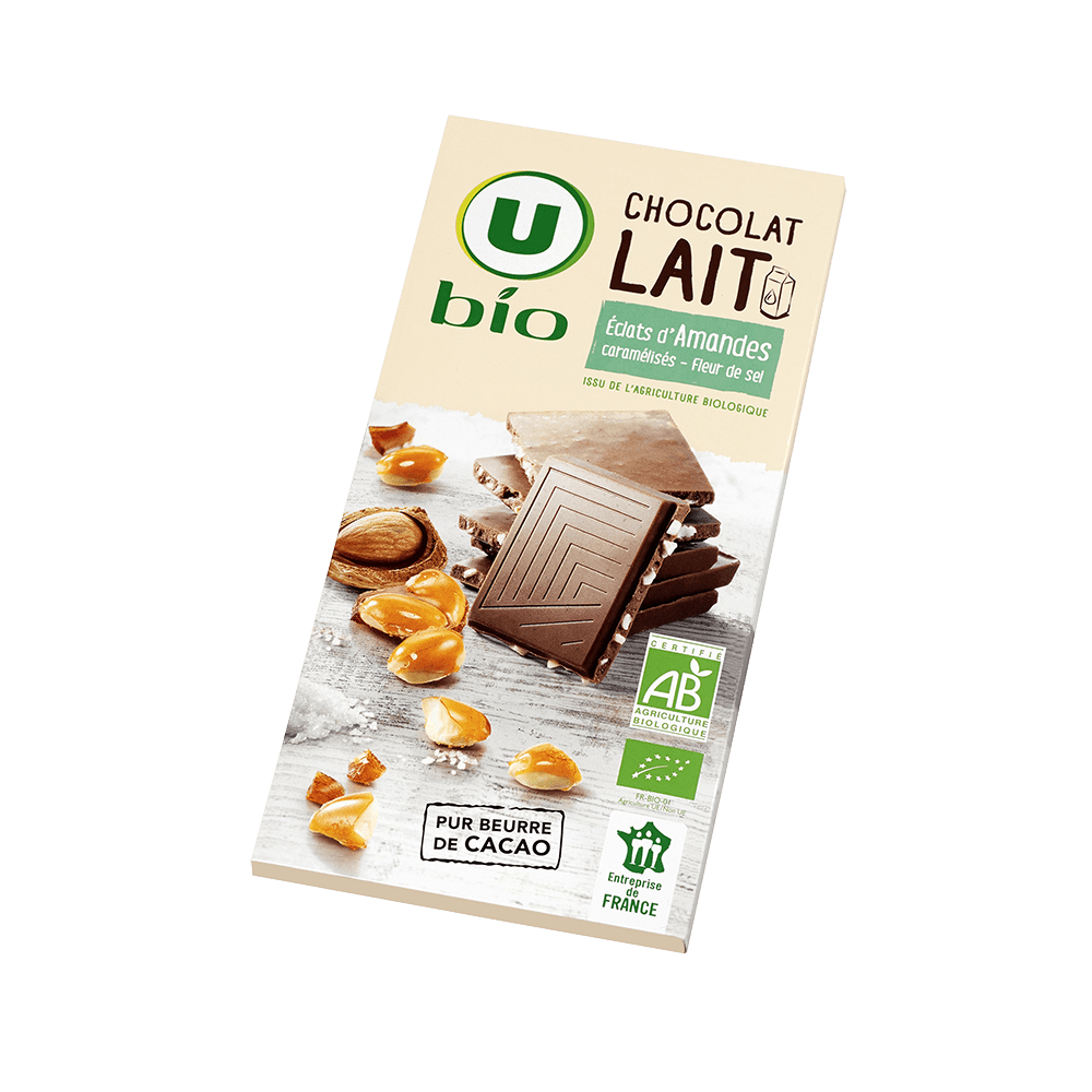 Chocolat supérieur au lait aux éclats d'amandes caramélisés issu de l'agriculture biologique et à la fleur de selChocolat supérieur au lait aux éclats d'amandes caramélisés issu de l'agriculture biologique et à la fleur de sel
