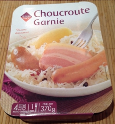 Choucroute cuisinée à la graisse d'oie 56,8% (choucroute, saindoux, Riesling 1%, oignons frits (oignons, huile végétale, farine de blé, sel), graisse d'oie 1%, sel, arômes, baies de genièvre, antioxydant : E300). Knack 14,9% (maigre et gras de porc, eau, maigre de bœuf, plasma de porc, sel, épices (dont moutarde), stabilisants : E450-E452, lactose, arômes naturels, dextrose, antioxydants : E300-E302, conservateur : E250. Boyau naturel de mouton). Pommes de terre 10,8% (pommes de terre, eau). Saucisse fumée cuite 10,8% (maigre et gras de porc, eau, sel, dextrose, épices et aromates, stabilisants : E450-E451, antioxydant : E300, sucre, conservateur : E250, arômes naturels. Boyau naturel de porc). Poitrine fumée cuite 6,7% (poitrine de porc, eau, sel, dextrose, antioxydant : E301, conservateur : E250)
