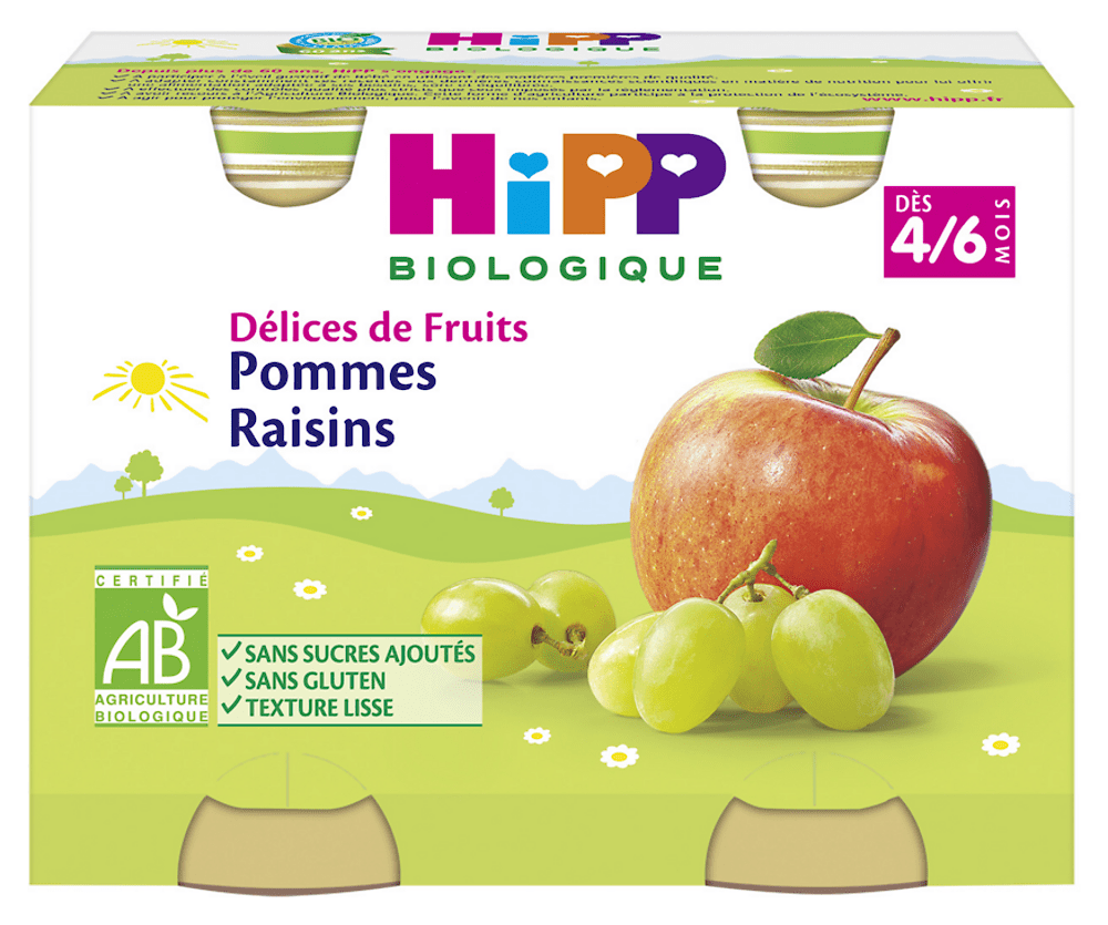 Compotes bébé dès 4/6 mois pommes/raisins sans sucres ajoutés HIPP BIOLOGIQUECompotes bébé dès 4/6 mois pommes/raisins sans sucres ajoutés HIPP BIOLOGIQUE
