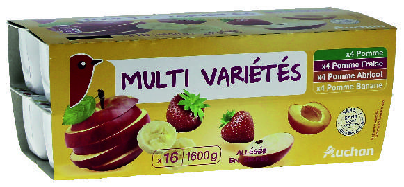 Parfum pomme : purée de pommes 95.7 % , sucre, antioxydant : acide ascorbique. parfum pomme fraise : purée de pommes 73.8% , purée de fraises 21.6 % , sucre, concentré (carotte et cassis) , antioxydant: acide ascorbique. parfum pomme abricot : purée de pommes 70.8 % , purée d'abricots 25 % , sucre, antioxydant: acide ascorbique, arome naturel d'abricot . parfum pomme banane : purée de pommes 78 %, purée de bananes 20 % , sucre, antioxydant: acide ascorbique.