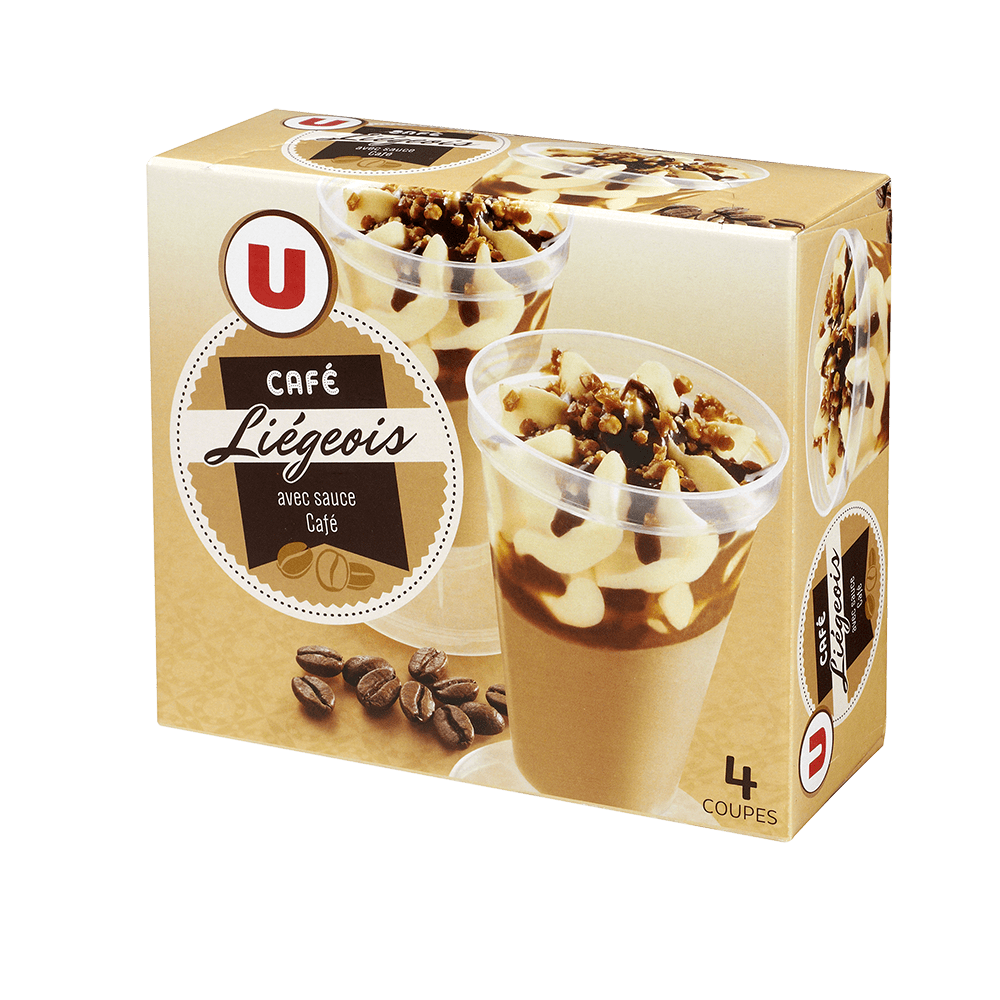 Crème glacée au café 43.7% : eau, sirop de glucose-fructose, CREME, sucre, LACTOSERUM, café soluble atomisé 2.3%*, concentré de protéines de sérum (LAIT), émulsifiant : mono et diglycérides d'acides gras, gélifiants : farine de graines de caroube - gomme guar, arôme, colorant : E150b. * Pourcentage exprimé sur la crème glacée au café. Crème glacée à la vanille 41% : eau, sirop de glucose-fructose, CREME, sucre, LACTOSERUM, concentré de protéines de sérum (LAIT), arômes naturels de vanille, émulsifiant : mono et diglycérides d'acides gras, gélifiants : farine de graines de caroube - gomme guar, colorants : rocou - curcumine. Sauce au café 9.8% : sirop de glucose-fructose, eau, café soluble atomisé 2.3%*, épaississants : gomme xanthane - gomme guar - carraghénanes, arôme naturel de café avec autres arômes naturels. * Pourcentage exprimé sur la sauce au café. Décor : Sauce au chocolat 3.7% : sirop de glucose, eau, LAIT écrémé concentré sucré, chocolat 12%* (sucre, pâte de cacao, cacao maigre en poudre), amidon modifié de maïs, BEURRE, sel. * Pourcentage exprimé sur la sauce au chocolat. Nougatines d'amandes 1.8% : sucre, AMANDES 30%*. * Pourcentage exprimé sur les nougatines d'amandes.
