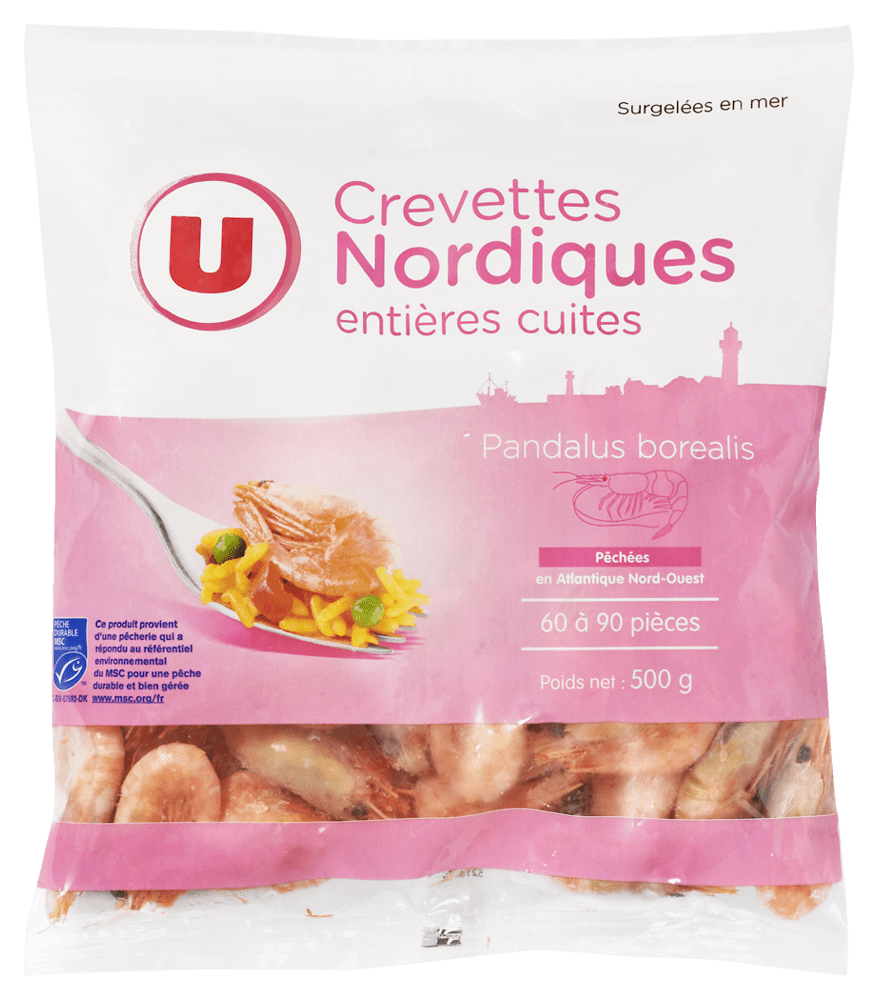 CREVETTES nordiques (pandalus borealis) 98,5% issues de pêcheries certifiées MSC pêchées aux chaluts en Océan Atlantique Nord-Ouest, sel.