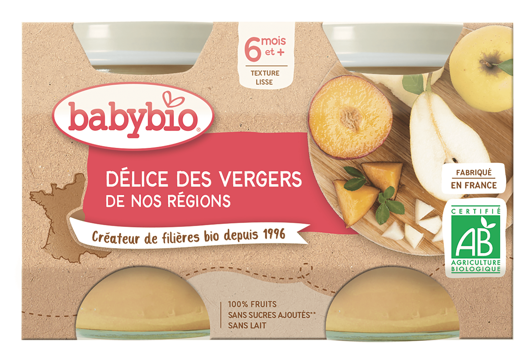Pommes de Nouvelle-Aquitaine* 55%, poires de Provence* 34%, pêches d'Occitanie* 11%. *Ingrédients issus de l'agriculture biologique
