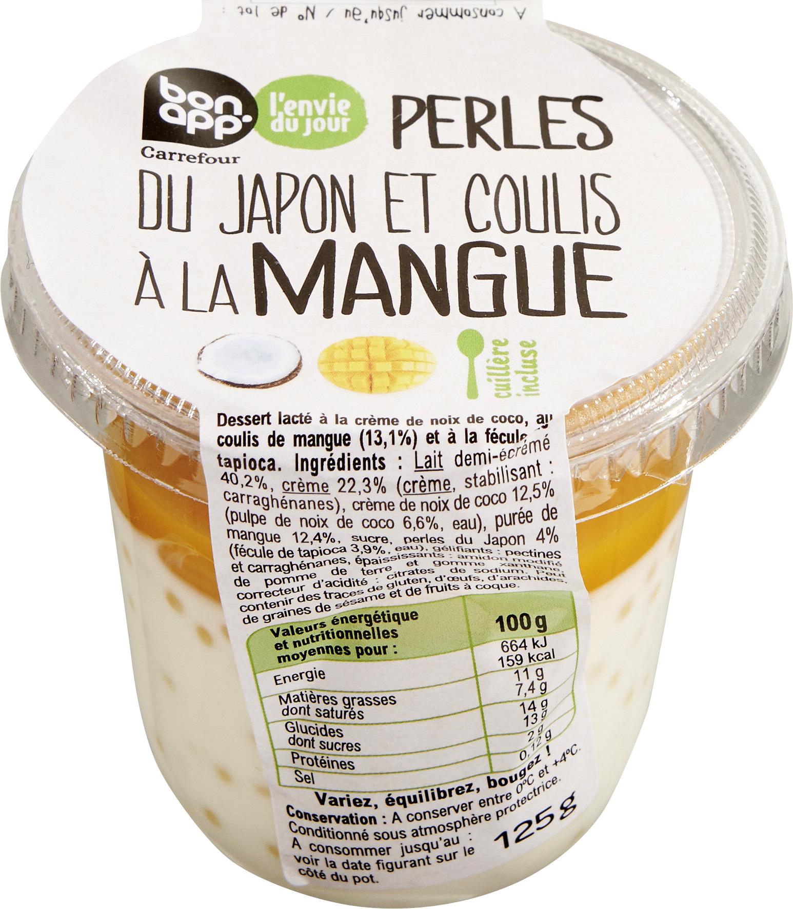 Dessert lacté à la crème de noix de coco, au coulis de mangue (13,1%) et à la fécule de tapioca LAIT DEMI-ÉCRÉMÉ 40,2%, CREME 22,3% (CREME, stabilisant : carraghénanes), crème de noix de coco 12,5% (pulpe de noix de coco 6,6%, eau), purée de mangue 12,4%, sucre, perles du japon 4% (fécule de tapioca 3,9%, eau), gélifiants : pectines et carraghénanes, épaississants : amidon modifié de pomme de terre et gomme xanthane, correcteur d'acidité : citrates de sodium.