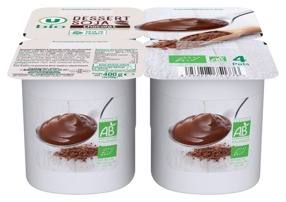 Jus de SOJA* (eau, SOJA* dépelliculé (origine : France) 6,5%), eau, sucre de canne*, poudre de cacao* 3,5%, amidon de maïs*, chocolat en poudre* 2,5% (poudre de cacao*, sucre de canne*), épaississant : carraghénanes, sel. *ingrédients issus de l'agriculture biologique